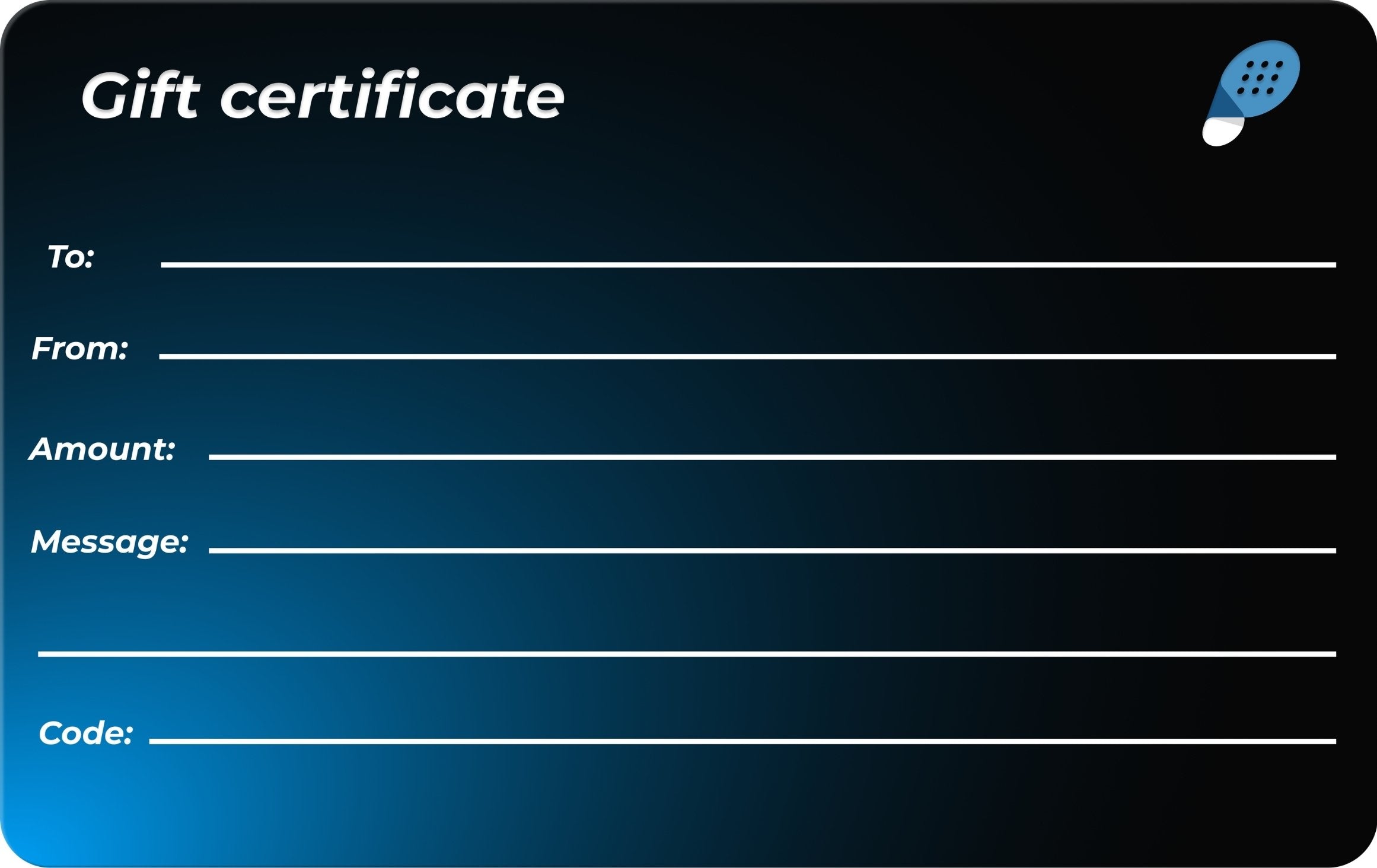 Not sure which racket, bag, or accessory to choose? A Padel Racket Gift Card is the perfect way to let them decide. From the latest rackets used by the world’s top pros to essential accessories like balls, grips, and bags, there’s something for every player at Padel Racket. How it works: Select your gift card amount, add it to your cart, and checkout. Receive the card instantly by email — either to you or directly to your recipient. For a personal touch, download our fillable PDF and print it at home. Simple. Fast. Always the right choice.